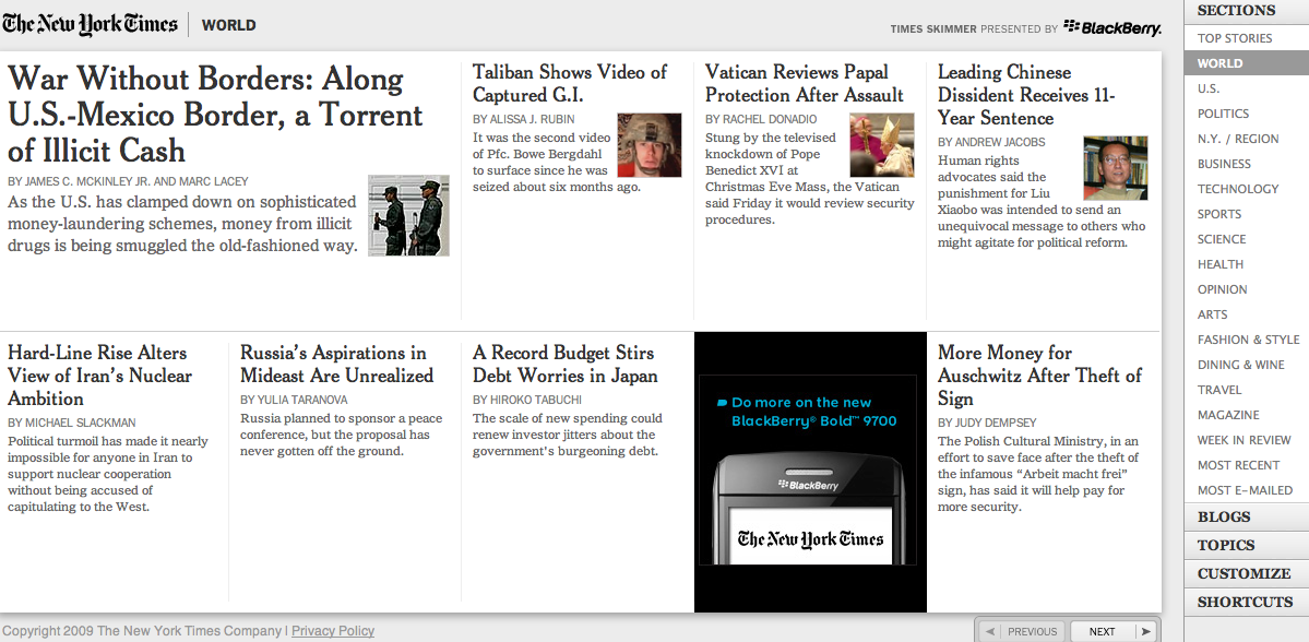 If you haven't yet landed on Times Skimmer, please check it out now. This browser is probably the closest version of how I envision online news delivered to me. Here are the main reasons behind my excitement with this new tool: